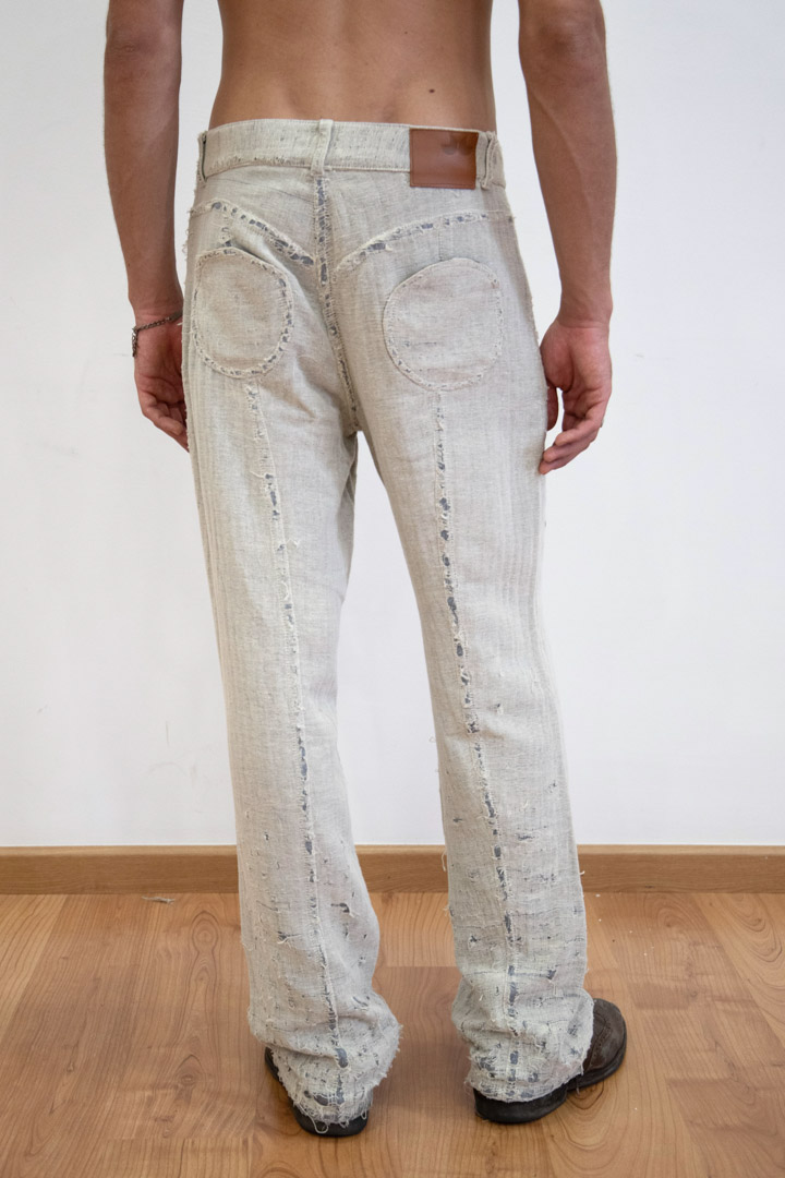 This product is Made To Order. The classic of the brand is back in a double beige fabric with a bluish base, manually distressed piece by piece in our atelier. Inspired by old grain sacks. Functionality and form in a timeless style. Also available in chocolate brown stretch corduroy or premium dark green British corduroy.